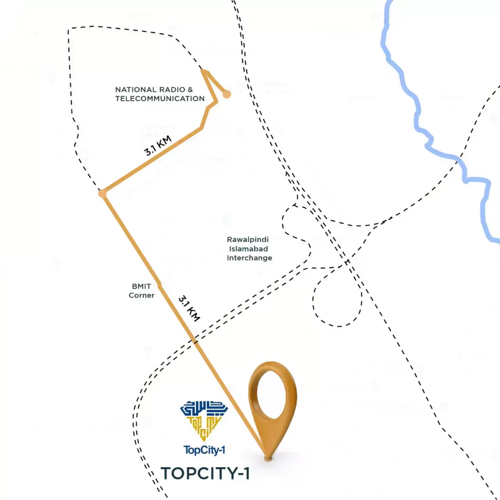 Top City Islamabad is strategically situated near the New Islamabad International Airport, with easy access to major roads like the Srinagar Highway and M-1 Motorway.