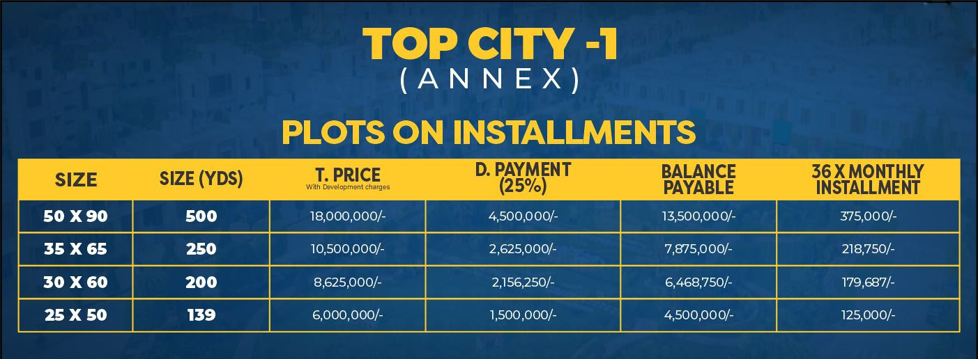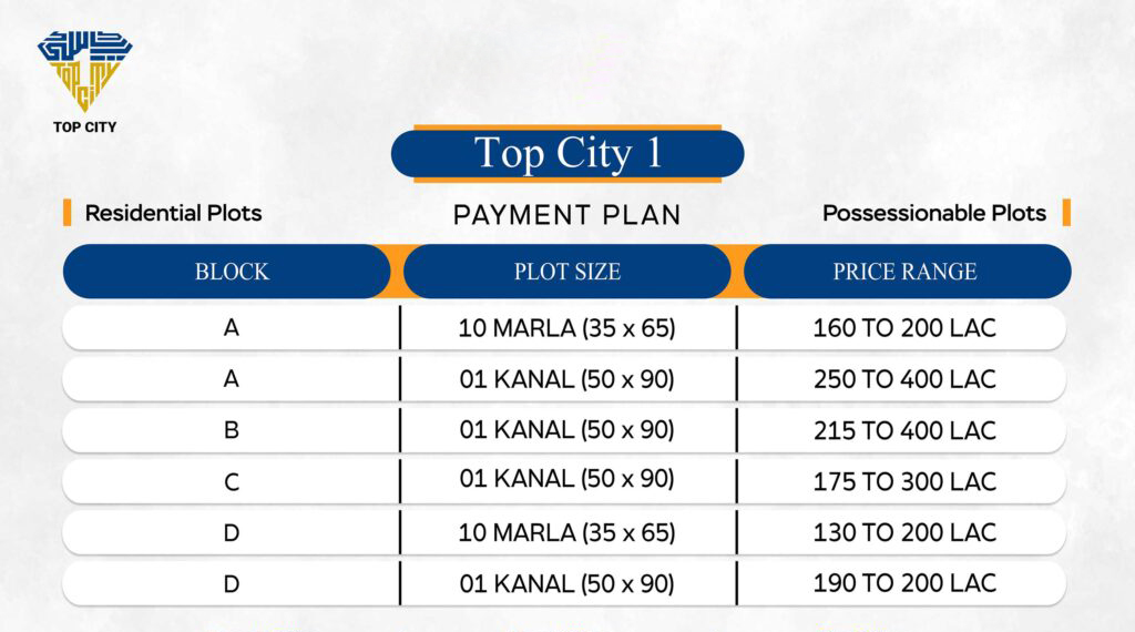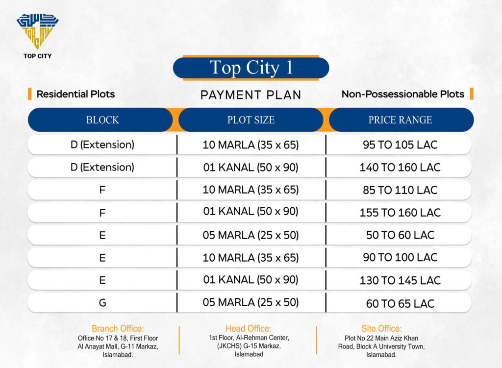 Top City Islamabad offers flexible payment plans, including 33 monthly installments, 11 quarterly installments, or 5 bi-annual installments. The booking fee is typically 10% of the total price.